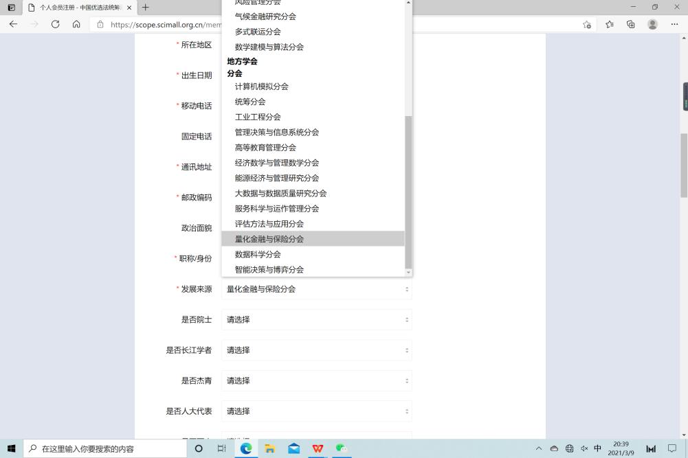 (2)进入注册页面后,根据提示完善个人信息,其中发展来源列表中选倒数第三项“量化金融与保险分会”。